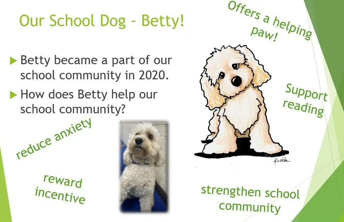 - To reduce anxiety…children who have been a bit nervous about coming into school, Betty gives them a helping paw and walks with them to the classroom!